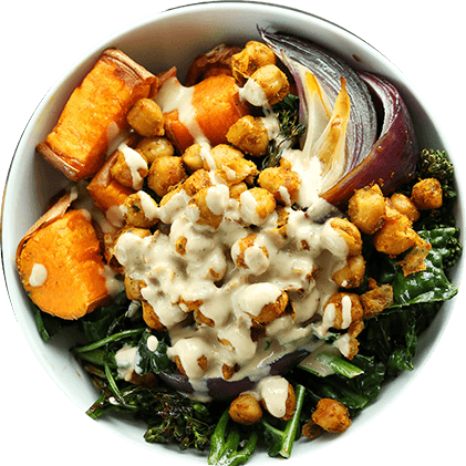 A wholesome bowl made with roasted chickpeas, fresh vegetables, grains, and flavorful dressing for a balanced and nourishing meal.